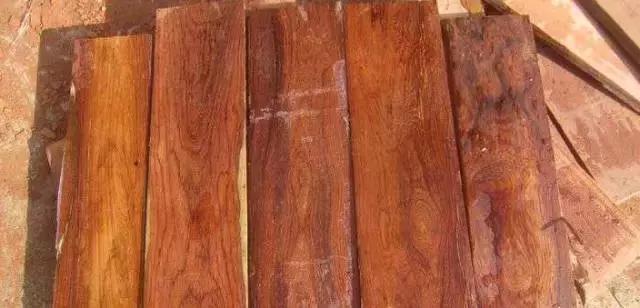 特征:心材多紫褐色、紫红色,少量黄色、黑色或紫色条纹、墨绿色条纹;原木砍伐后,端头如未及时封蜡,常温下会由两端向内颜色变深,木材在阳光下暴晒,颜色可变淡。