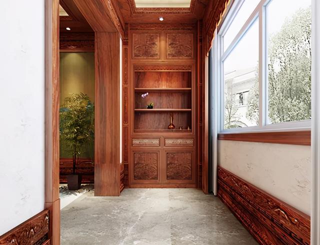 走到过道的尽头,就可以看到一组玄关空间,嵌入式的红木装修,更显玄关的气派典雅之感。