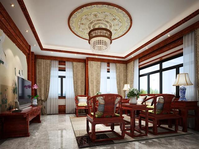 步入客厅之中,能够感受到气势恢宏的空间感,简约化的中式藻井天花板,搭配厚重悠然的中式沙发,整个客厅叫人惊艳不已。