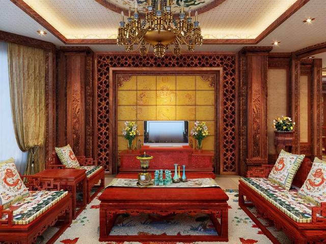 走进客厅之中,能够感受到金碧辉煌的空间感,不管是红木沙发的陈设,还是古典吊灯的点缀,都让整个客厅拥有古色古香的气质。